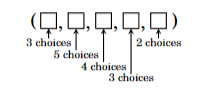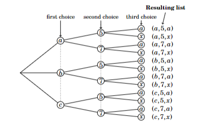 For example, suppose we make a list of length three having the property that the first entry must be an element of the set {a, b, c}, the second entry must be in {5, 7} and the third entry must be in {a, x}. Thus (a, 5, a) and (b, 5, a) are two such lists. How many such lists are there all together?