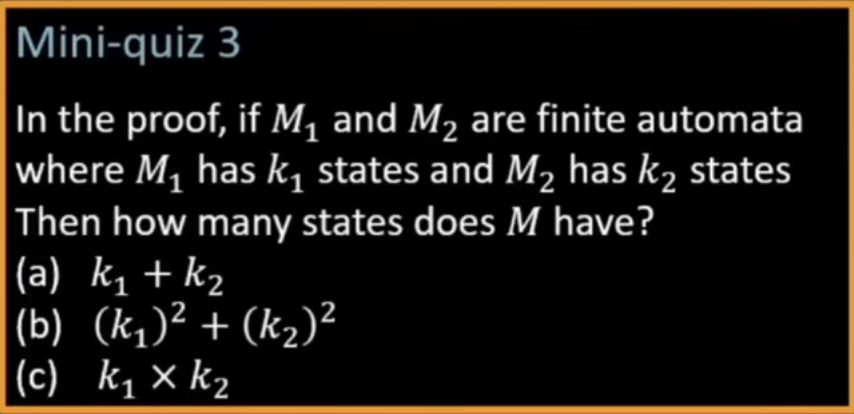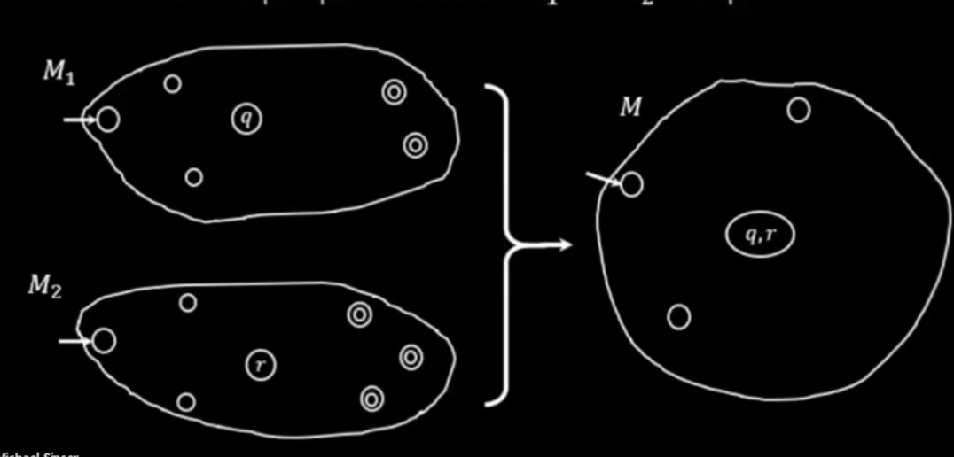 Components of M: : the set of states of is just the possible states of and : the starting state of is the starting state of and : the transition function of is basically the transition functions of and since tracks the states of both. so to get the ‘next state’ of we need the next states of and M_2 is their transition functions : the final state of is the union of the 1. all possible states of the, final state of and any state from . 2. all possible states of and the final state of .