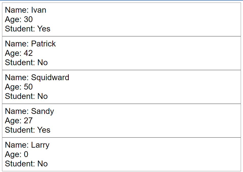 <Student name="Squidward" age={50} isStudent={false}/>