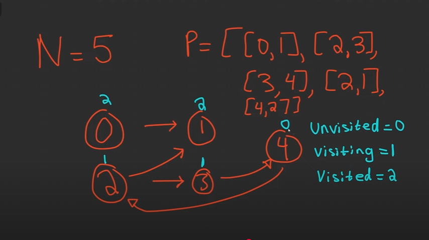 from collections import defaultdictclass Solution(object): def canFinish(self, numCourses, prerequisites): """ :type numCourses: int :type prerequisites: List[List[int]] :rtype: bool """ # iterative dfs with a stack g = defaultdict(list) courses = prerequisites for a, b in courses: g[a].append(b) UNVISITED = 0 VISITING = 1 VISITED = 2 states = [UNVISITED] * numCourses def dfs(node): state = states[node] if state == VISITED: return True elif state == VISITING: return False states[node] = VISITING for nei in g[node]: if not dfs(nei): return False states[node] = VISITED return True for i in range(numCourses): if not dfs(i): return False return True
